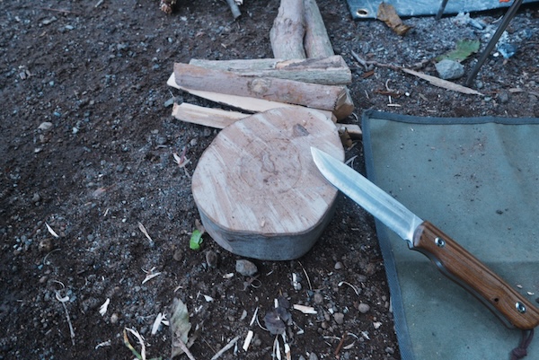 薪割りには、ナイフの刃を守るためにも必須の台ですね。
